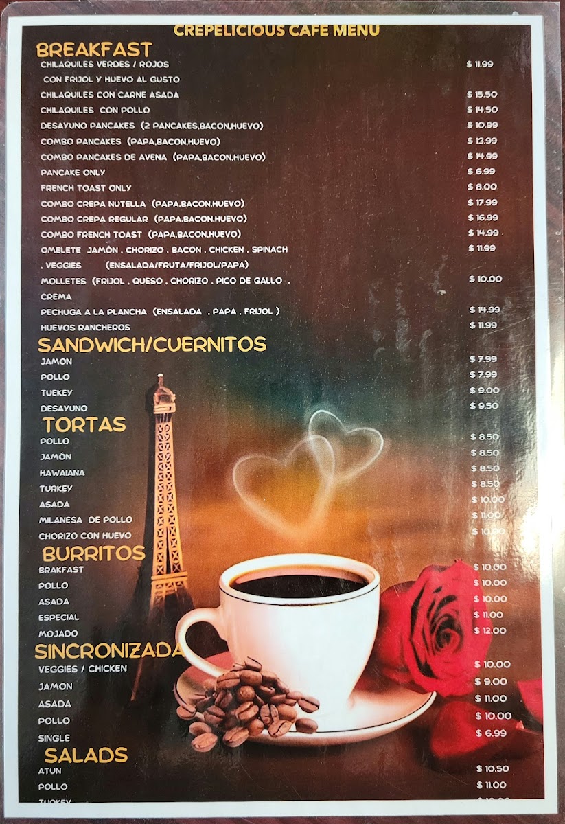 Crepelicious Cafe offers a delightful and diverse menu perfect for any meal of the day. For breakfast lovers, the options are abundant, starting with the Chilaquiles Verdes/Rojos or simply Chilaquiles for $7.99, offering a delicious Mexican twist with tangy salsa and crispy tortillas. You can also opt for ChilaquileDesayuno Pancakes for $8.99, or indulge in their fluffy Omelets or hearty Breakfast Burritos at $8.99. The Pollo and AsadaEspecial burritos are flavorful highlights, with prices around $8.99. The Mojado burrito at $9.99 brings a unique touch with a saucy twist.