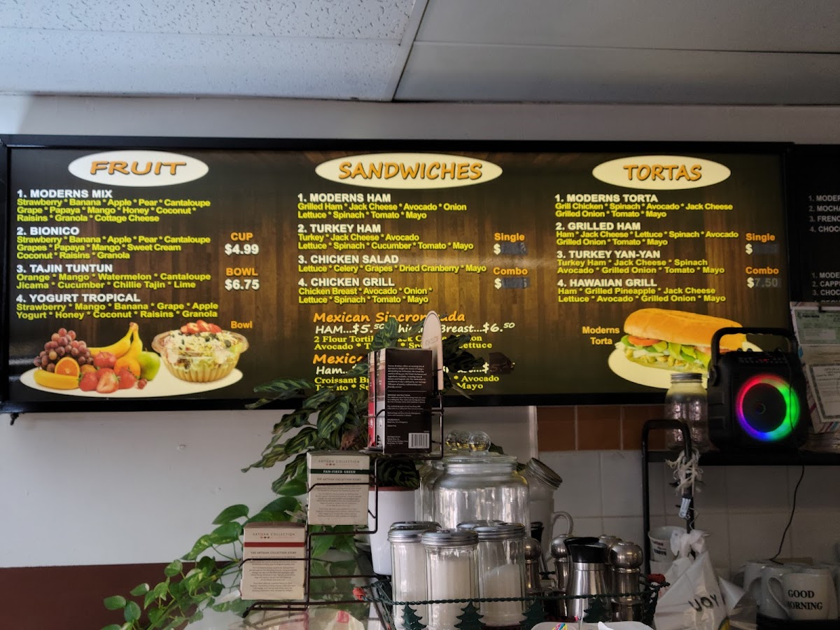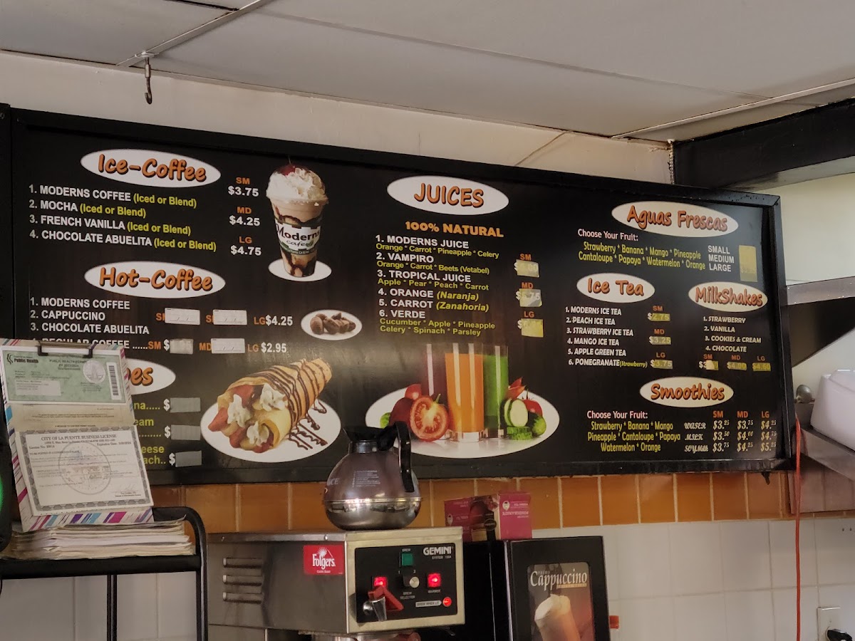 For those looking for a caffeine fix, the Ice-Coffee menu includes Moderns Coffee, Mocha, and French VanillaChocolate Abuelita, with prices ranging from $4.99 to $5.99. The hot coffee options, including Cappuccino and Chocolate Abuelita, are also popular, with prices around $4.99.