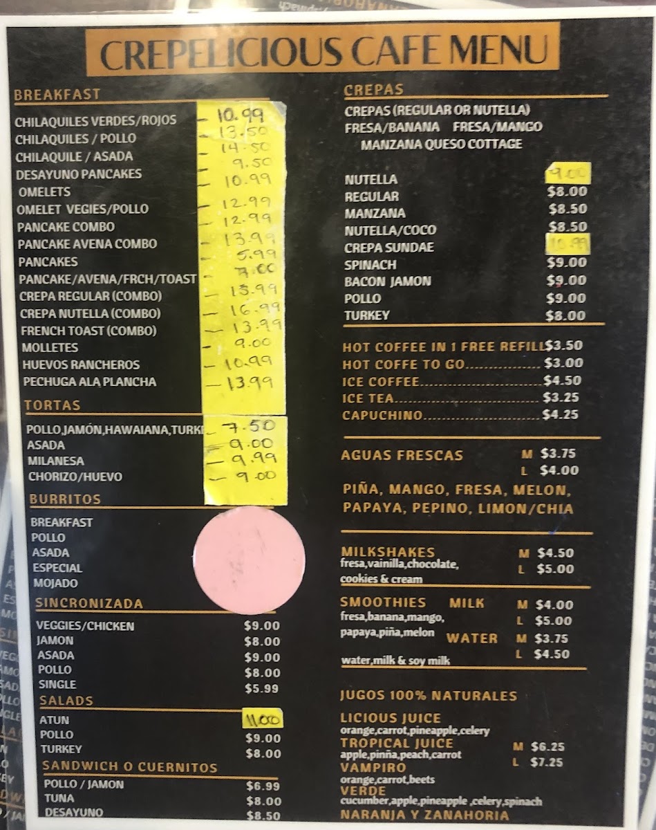 If you're craving something sweet, the cafe’s Crepas menu is a must-try. Indulge in the rich and creamy Nutella crepe for $7.99, or opt for the Regular or ManzanaNutella/Coco varieties, both priced at $8.99. The Crepa Sundae, priced at $9.99, is the perfect combination of dessert and indulgence. For drinks, the 100% Naturales Jugos include refreshing options like Tropical Juice, Vampiro, and Licious JuiceVerde, each priced at $4.99.
